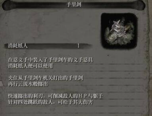 2、作用:在忍义手中装入了手里剑车的义手忍具,消耗纸人便可以使用,快速掷出的利刃,可削减敌人的HP与躯干,针对四处跳跃的敌人可给予其大伤害。