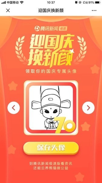 “请给我一面红旗@微信官方”就是个谎言,嘻嘻嘻!你可以通过这个来自腾讯新闻极速版通过微信的一个H5页面,制作一个带有70周年国庆庆典头像,然后发一条这样的说说哈。