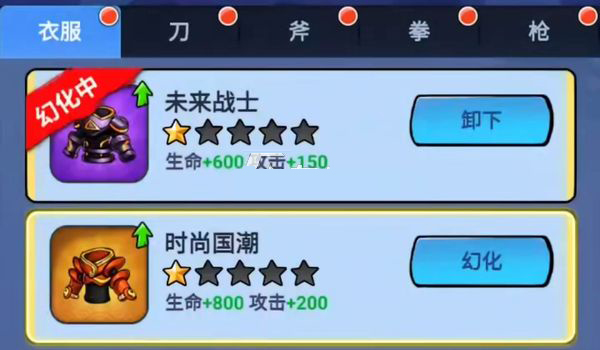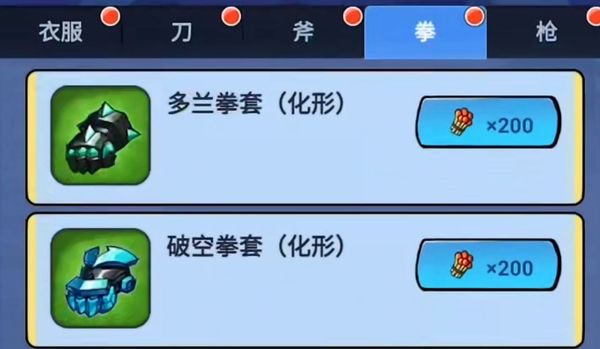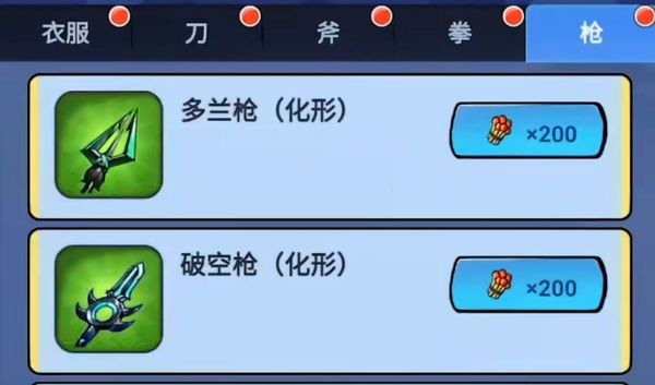 那么在游戏中的武器一共分为哪几种呢?分别是刀,斧,拳,枪。这四种武器分别有自己的优势,他们在游戏中的进化都是需要火柴来进行进化的,第一阶段是多兰系列,第二阶段是破空系列,想要获得他们都需要消耗200火柴