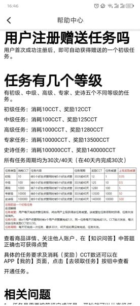 链信里面的任务都是有着40天有效期的,在这40天内可以完成30次,从初级任务到史诗级任务的产量是不同的,同样领取条件也是不一样的,都是要通过足够的cct来兑换相应的任务,拥有的cct越多就可以兑换更加高级的任务,同时额外得到的cct也会越多,cct可以通过OTC平台购买,或者是推广足够多的的新用户产生的cct。