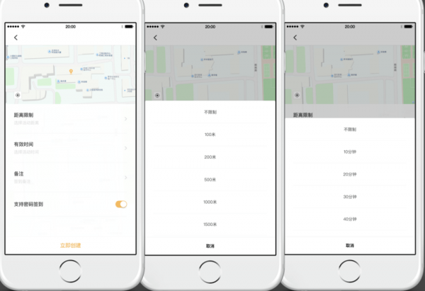 不限、50米、100米、300米、500米、1000米、1500米,后台签到判断距离加上10%米数,选择距离后,坐标位置发散对应距离覆盖物。