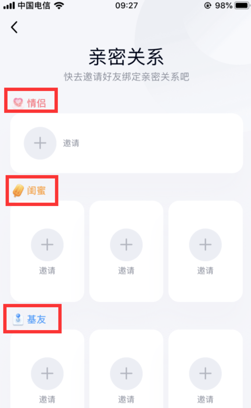 进入后,就可以选择邀请好友来绑定关系,可以绑定情侣、闺蜜和基友关系。