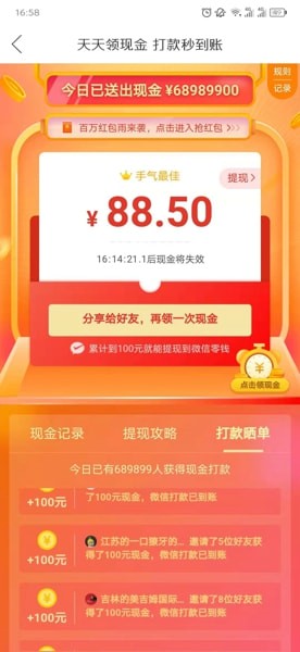 在拼多多APP里面找到天天领现金的入口,进入之后就可以获得一定的金额,首次进入就会有八九十的金额,然后七七八八的一弄就会达到九十几块的样子,相信很多人都到了这一步,但是是要满足100的门槛才能够提现到微信账户的哦!