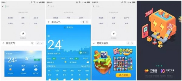 由于输入法本身是以半屏“现身”的,所以其小程序的展示形态上也十分“别具一格”。进入小程序后,它首先会以二分之一屏的大小出现,点击某个功能后,它才会展开直至占据四分之三屏幕大小。值得注意的是,如果是游戏的话,小程序会进入全屏状态。
