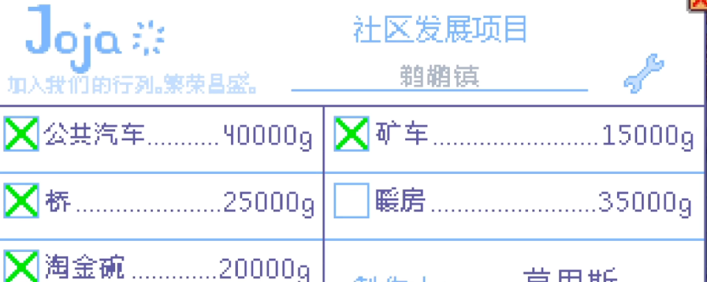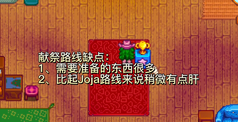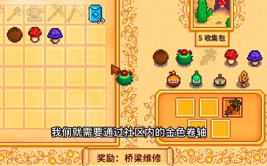 献祭路线就是通过社区中心的卷轴将不同物品给祝尼魔,就可以完成收集包,没完成一个收集包就可以获得一个奖励,一共有六个房间,每个房间的收集包数量都是不一样的,完成所有房间的收集包后,JOJA超市就会倒闭,我们可以将超市改造为电影院。