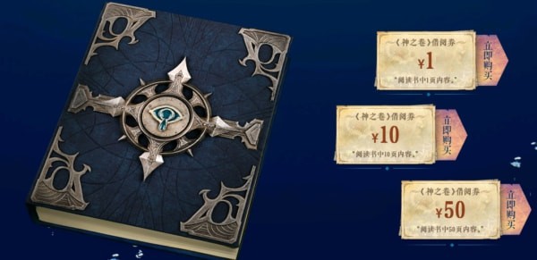 2、勇士购买《0盼官方设定齋神之卷》借阅券同时会获得等量卷灵,每购买1张借阅券可阅读1页《0阢官方设定集神之卷》内容,并且可参与阅读抽奖奖励,消耗不同数量的卷灵可以兑换获得不同的精美周边产品,同一^005^不同订单借阅次数可叠加;