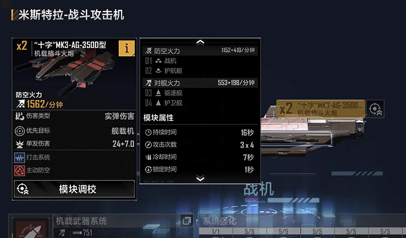 我们看在来看武器数据,格斗火炮24秒的打击时间,格斗**无打击时间,防空输出主要是靠格斗**,我们好不容易触发的被动防空肯定越长越好。