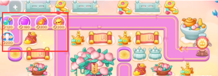 4、右上角设置满级飞机,桃树上面一个泡泡塔,右边也放置飞机,之后有金币在上面放置飞机。