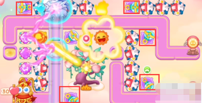 1、主要炮塔选择泡泡塔、魔法球、火炮、太阳、飞机,主要输出飞机。