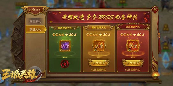 3、宝宝:宝宝是每个玩家都有的,是打怪爆装备的得力助手,非常强力,可以用绑定元宝免费升级,切记优先提升宝宝,在新区有宝宝福利。比如我买了攻速+攻击礼包,现在混的还不错,区内十强。土豪玩家建议全部购买,性价比很划算!