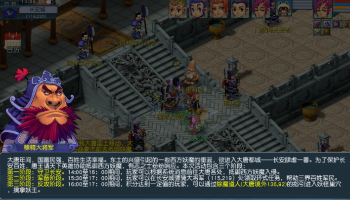 在15:30至17:00期间,玩家可以在长安城骠骑大将军(115,219)处领取环式任务,帮助三界百姓军民。