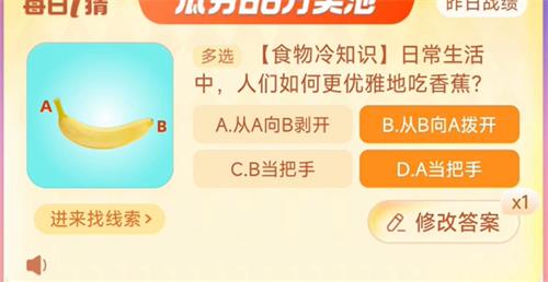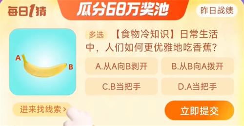 淘宝每日一猜12.21的问题是有关于香蕉的优雅吃法的,许多的小伙伴是不是还不知道每日一猜12.21的答案是什么呢?下面小编就给大家带来了此问题的答案一览,感兴趣的小伙伴快来看看吧。