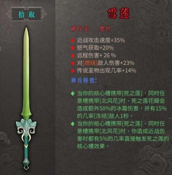 (1)当你的核心槽携带[死之莲],同时任意槽携带[北风花]时,死之莲花瓣会造成额外50%的冰霜伤害,并有15%的几率[冻结]敌人1秒。