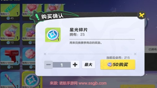 3、使用云朵币购买大概是50个云朵币可兑换一个星光碎片,且限购20个。