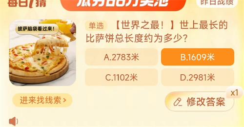 世上最长的比萨饼总长度约为多少是今日的问题,需要玩家在进来找线索中选择答案,那么世上最长的比萨饼总长度约为多少问题的答案是什么呢?下面小编就给大家带来了此问题的答案一览,大家快来看看吧。