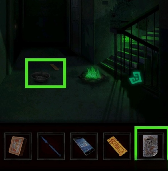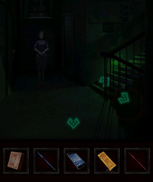 8、完成解谜获得手机,在楼道内使用手机,选择没人的道路,在三楼的门上撕下门神。