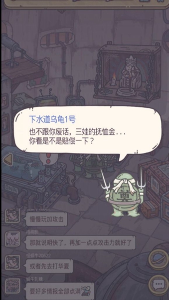 最强蜗牛中当玩家击杀了房间中的小动物的时候,下水道的乌龟会找上门,问我们要100w的黑蝌蚪,这对于大部分的玩家来说都很难接受,毕竟100w的黑蝌蚪怎么能说给就给,那么不给他们这个抚恤金还会不会触发剧情呢?下面小编为大家带来了不给抚恤金就能解决的办法,不知道的小伙伴一起来看看吧。