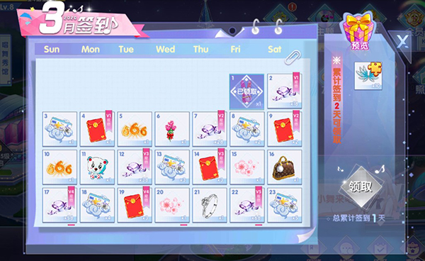每日签到是不是很简单?签到就送服饰送金币送钻石,要不要?在游戏社区右上方可以看到到签到按钮,记得每天去签到。