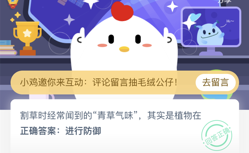 支付宝蚂蚁庄园小课堂5月21日的问题是:割草时经常闻到的“青草气味”,其实是植物在?这道题考查了用户对青草气味的了解,为什么割草的时候会闻到这股气味呢?下面小编就为大家带来蚂蚁庄园今日答案,一起来看下正确回答吧。