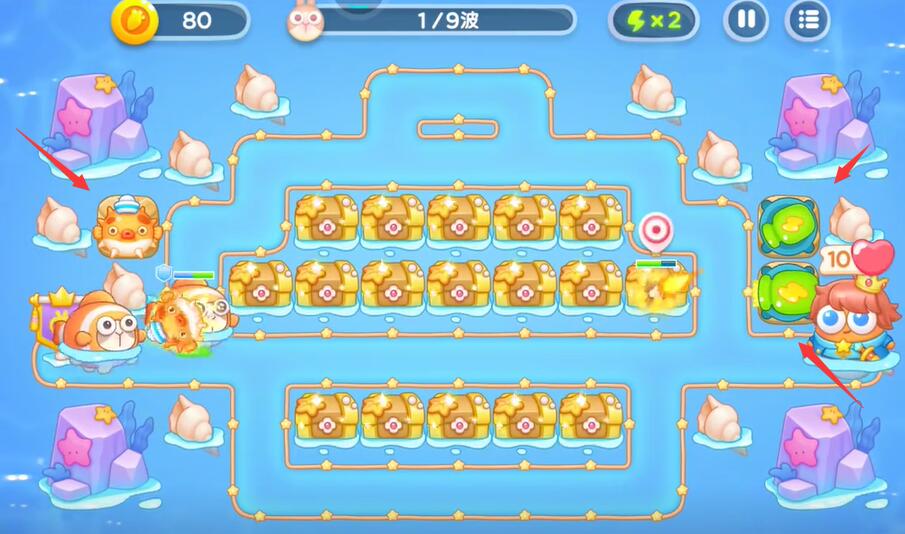 3、清理掉中间的宝箱,可以获得各种类型的防御塔,并且可以对其进行升级。