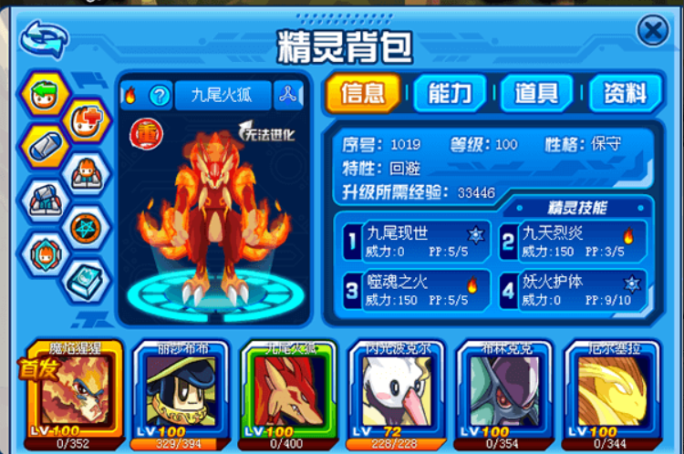 基础信息赛尔号九尾火狐是火系的超 NO 精灵,也是许多玩家童年里梦寐以求的形态,满足了大家对异世界的幻想,因此收获了绝大多数玩家的喜爱。虽然它的种族值并不高,总和只有 602,但在 PVE 中表现十分强势,搭配一些强力的辅助精灵,依然能够击败不少 BOSS 精灵。只是在 PVP 模式里,却很少能见到九尾火狐的登场。