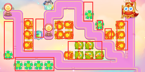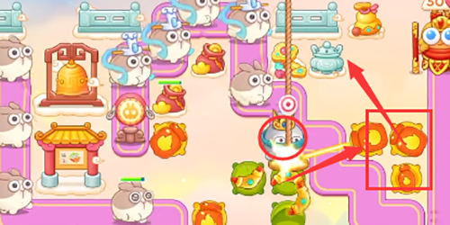 1、本关能够使用的炮塔是:毒针、风扇、回旋镖、火瓶、双菱塔,这一关我们推荐使用火瓶+风扇。
