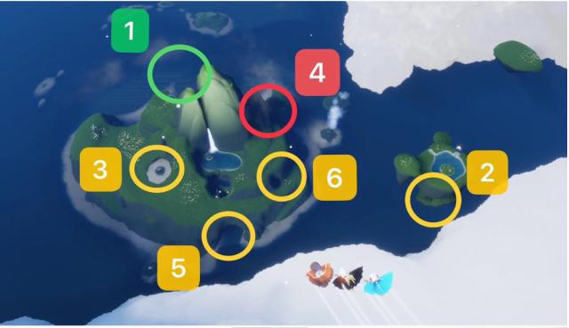 光遇水母叫先祖就是母语者先祖,在圣域群岛最高山的背面,对应下图的1。