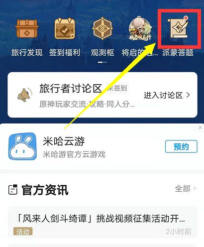 1、首先打开米游社,点击右上角的派蒙答题进入;