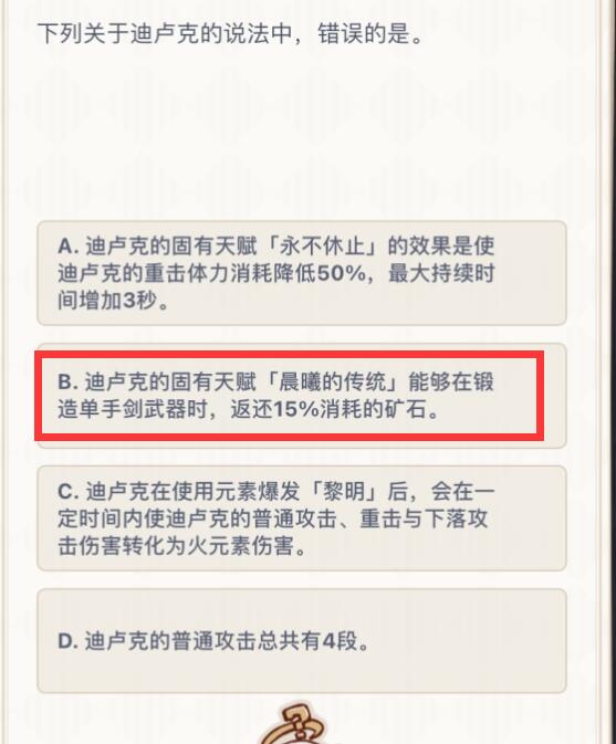正确答案:迪卢克的固有天赋【晨曦的传统】能够在锻造单手剑武器时,返还15%消耗的矿石