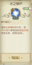 技能【水面横斩】命中敌方后,可以百分之百令对手免疫负面效果失效两回合,可以配合污水源以及水虚弱效果使用。