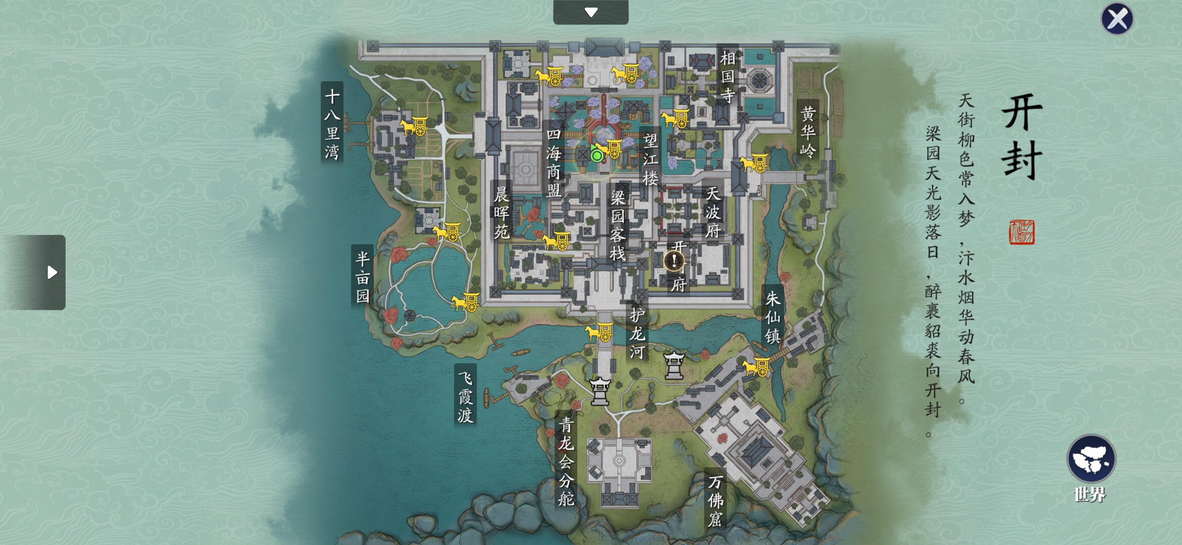 1、首先前往开封的四海商盟,找到门口客人激活奇遇,位置如下(527,796):