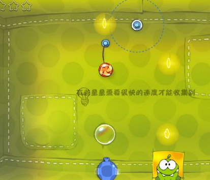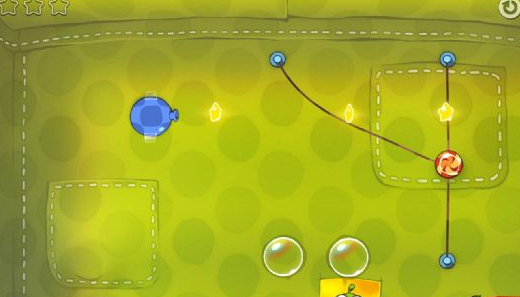 2、将左上的绳子剪断后,糖果进入气泡,飘到最高处将气泡戳破,利用绳子摆动至欧罗姆方向时即可剪断绳子。