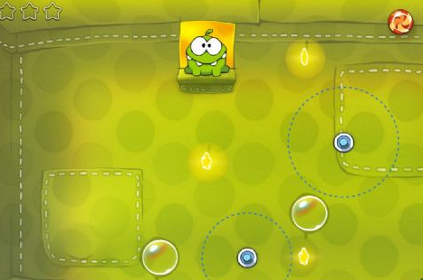 1、将上面的绳子剪断后,再剪断下面的绳子使有糖果进入气泡,然后利用气垫将其吹到欧罗姆上方戳破气泡即可。