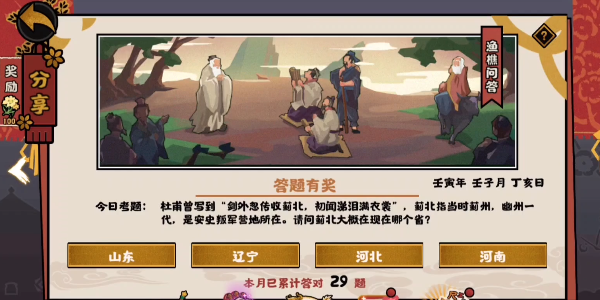 无悔华夏渔樵问答活动11.30的问题是:杜甫曾写到“剑外忽传收蓟北,初闻涕泪满衣裳”,蓟北指当时蓟州,幽州一代,是安史叛军营地所在。请问蓟北大概在现在哪个省?那么下面就跟小编一起来了解一下正确答案吧。