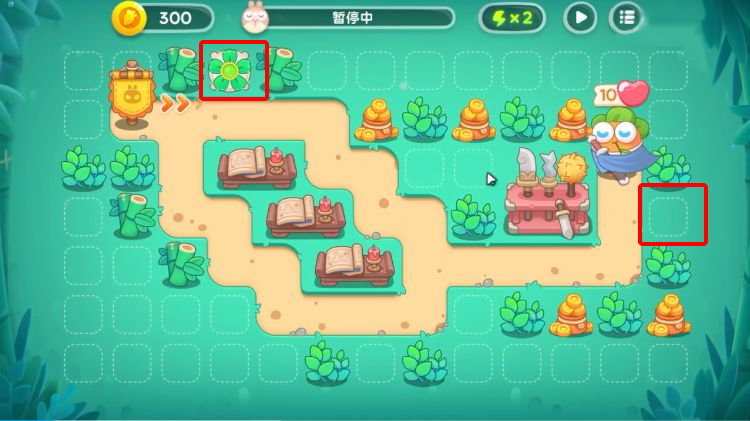 1、在地图左上角种植一个风扇并升级,可以在打怪的同时清理左侧的地图。在终点空格处种植一个炮塔用来清理地图。