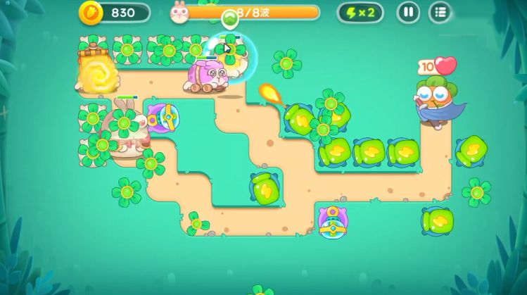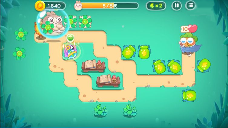 2、然后继续在左上角种风扇并进行升级。右下角逐渐将周围全都清理掉,如果兔兔过来了优先攻击兔兔。左上角的中间种植一个泡泡塔用来拖慢兔兔脚步。
