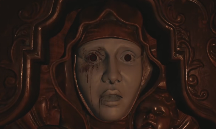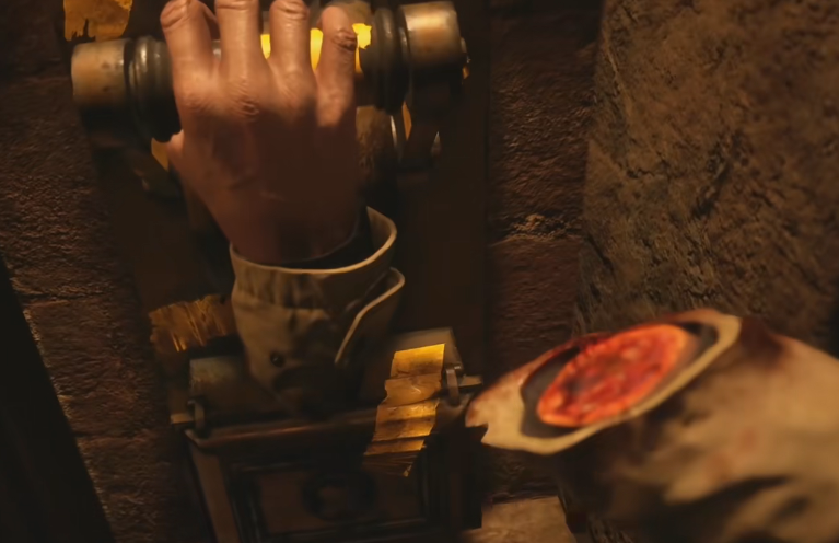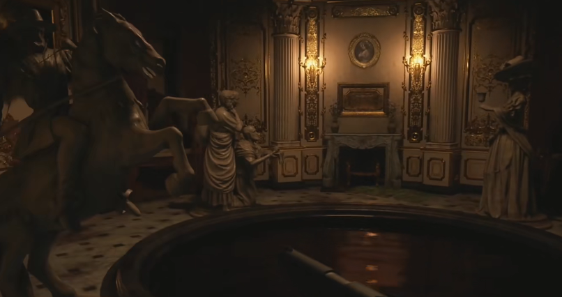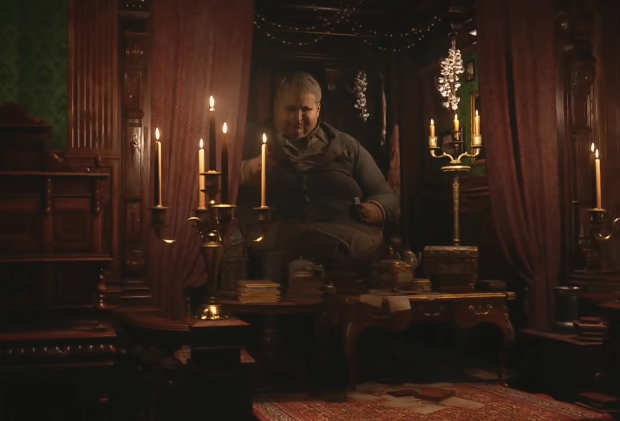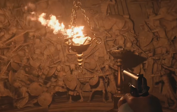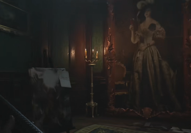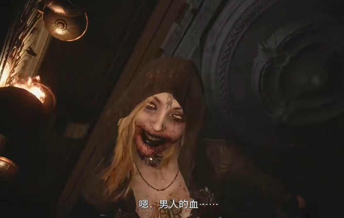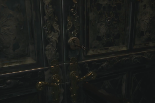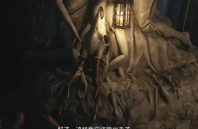 1、进入古堡经过一段路后,在拉下门把手时,海森伯格出现,将伊森带入议会厅。