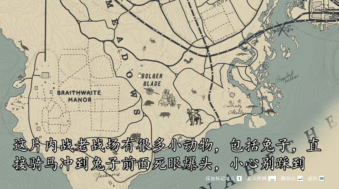 1、来到地图下方的内战老战场,这里有很多的小动物,包括兔子,我们直接骑马冲到兔子前面用死眼爆头,小心别踩到。