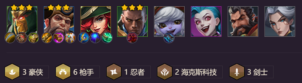 2、阵容分析:3豪侠为金币垫下基础,6枪手开局火力出击,御界守前排抗伤,海克斯科技开局降低敌方英雄攻速,更好的拖延敌方输出。