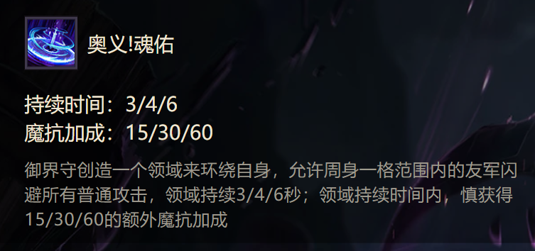 解析:御界守作为前排英雄,技能辅助队友存活最大化。