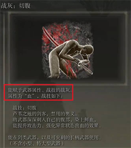 1、切腹战灰可以赋予武器切腹战技,把武器的属性改为“血”属性;