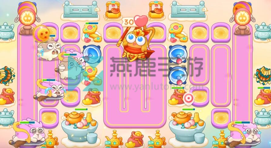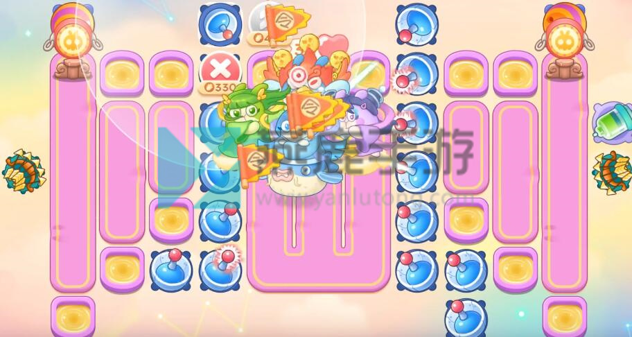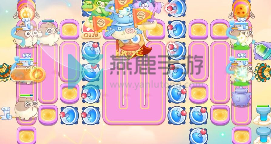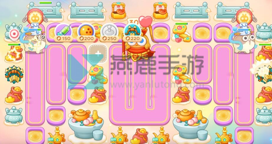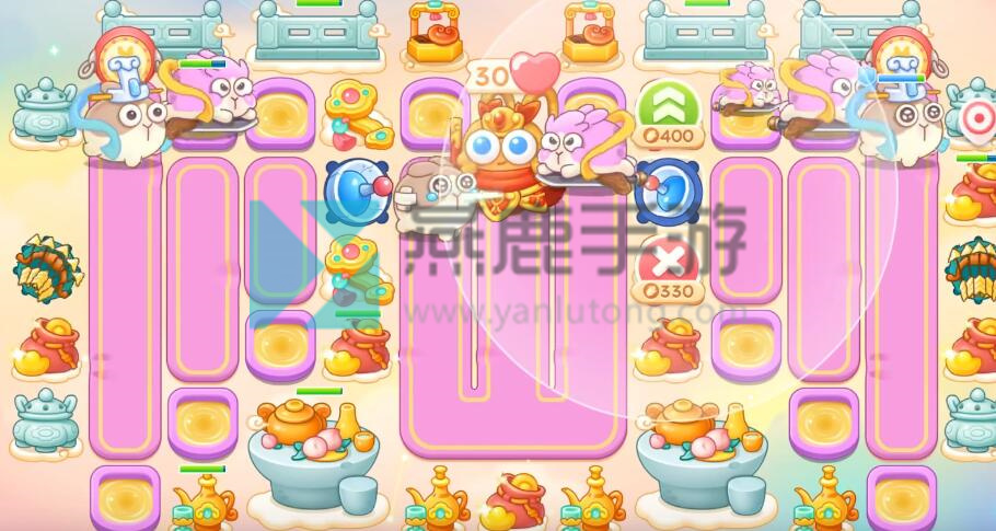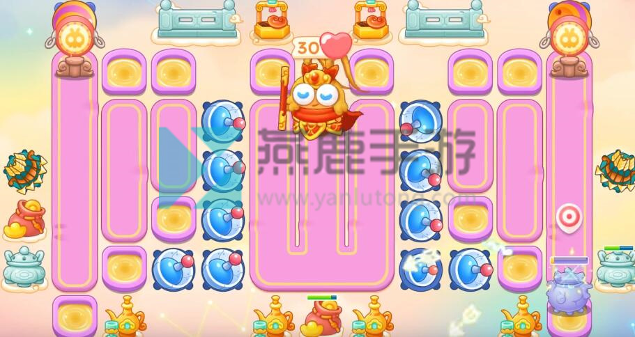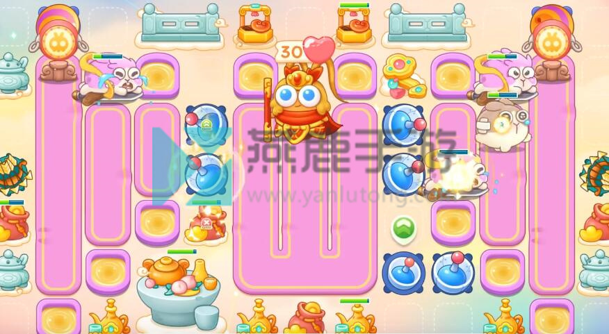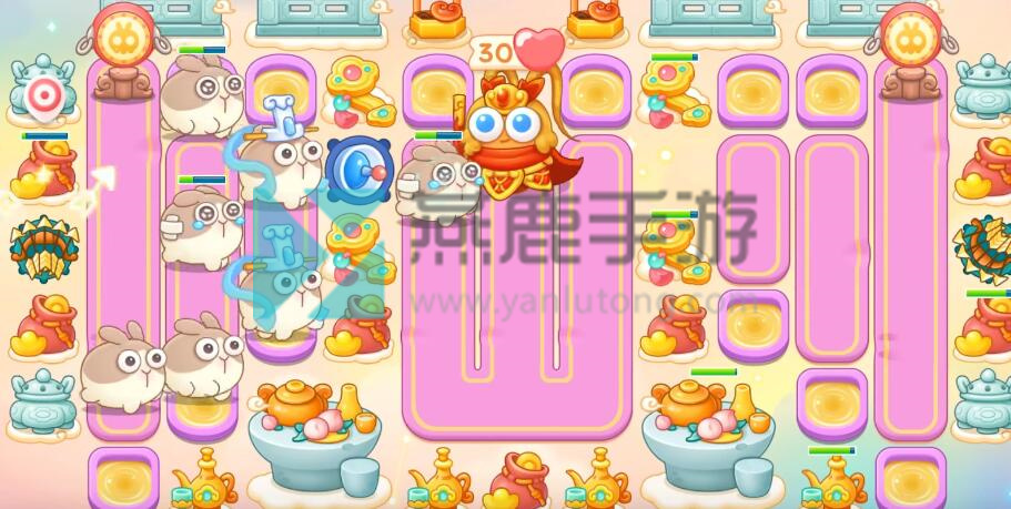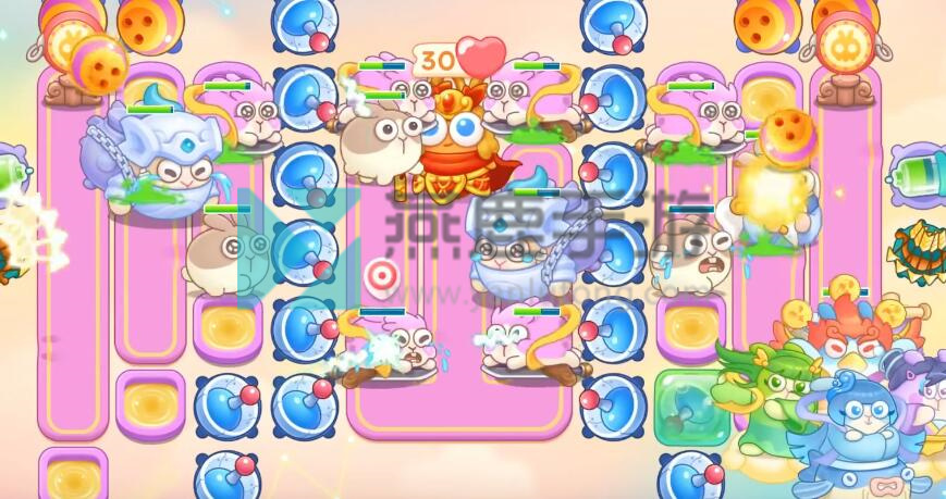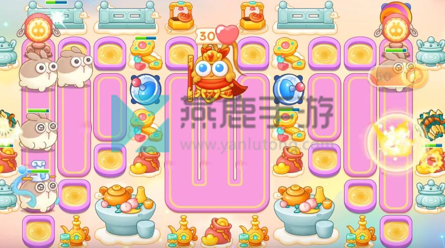 4、跟着神仙买雷达,不想打钉子,就在钉子周围买一级炮塔,其他就打掉,建议后期开一倍速,因为有很多粉兔和重生兔,在上面增加保龄球。