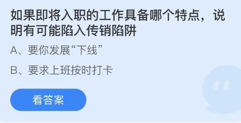 3月15日蚂蚁庄园小课堂其中一个问题是:如果即将入职的工作具备哪个特点,说明有可能陷入传销陷阱?很多小伙伴还不知道问题答案,那么下面小编就为大家带来了蚂蚁庄园3月15日正确答案,一起来看看吧。