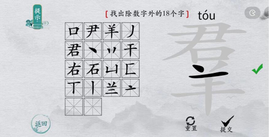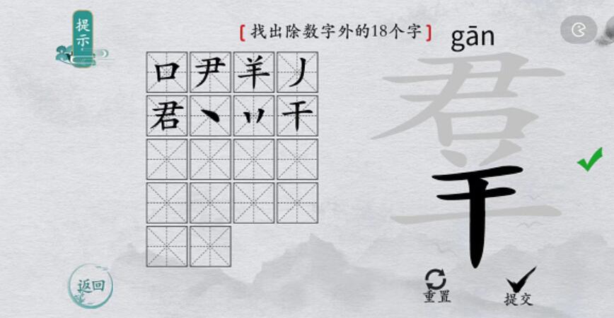 2、第二行,从左往右的答案分别是:【君、丶、丷、干】。