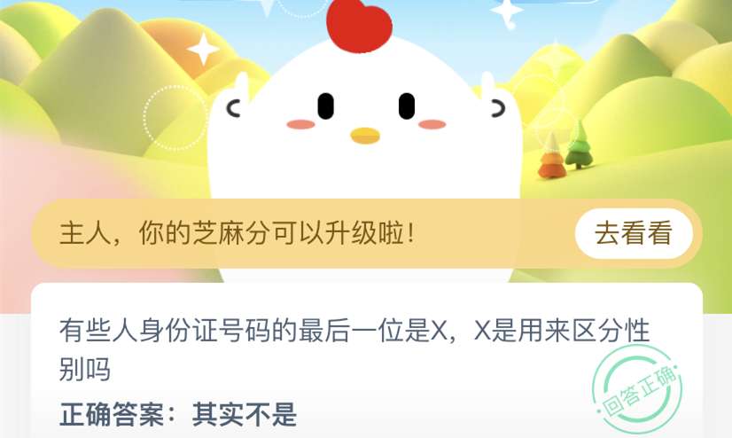 支付宝蚂蚁庄园小课堂6月12日的问题是:有些人身份证号码的最后一位是X,X是用来区分性别吗?这道题考查了用户对身份证号码的了解,最后一位X代表什么呢?下面小编就为大家带来蚂蚁庄园今日答案,一起来看下正确回答吧。