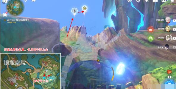 3、之后要前往核心轮毂的登亭处,可以先前往银瓶庭院东侧传送点,向南方向走,到达下图角色箭头位置,拉四叶印上山;