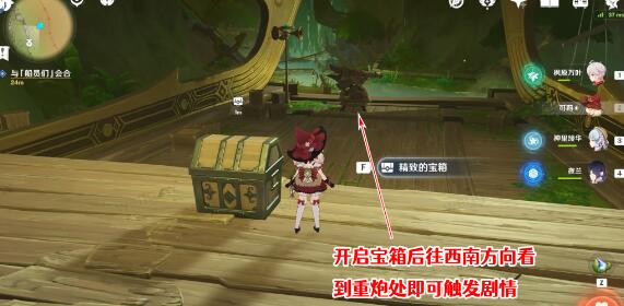 10、等躲避完成后,「先成图」中就会出现退出的传送门,甲板上还会出现一个精致的宝箱,开启宝箱后,往西南边看,走到这边的重炮处,自动触发后续剧情;