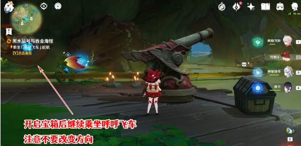 6、击败之后,在重炮旁边就会出现精致的宝箱,开启宝箱继续乘坐呼呼飞车继续前往下一处地点,玩家直接上车即可,不需要改变方向;