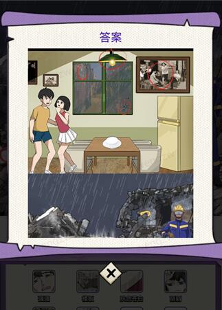 进入游戏后,会发现大雨倾盆,主角即将遭遇地震,玩家可以点击屋顶的灯泡、碎裂的玻璃,墙上的合影,窗外的落石。
