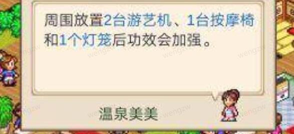 在温泉的附近放置两个游艺机以及一个按摩椅和灯笼即可。